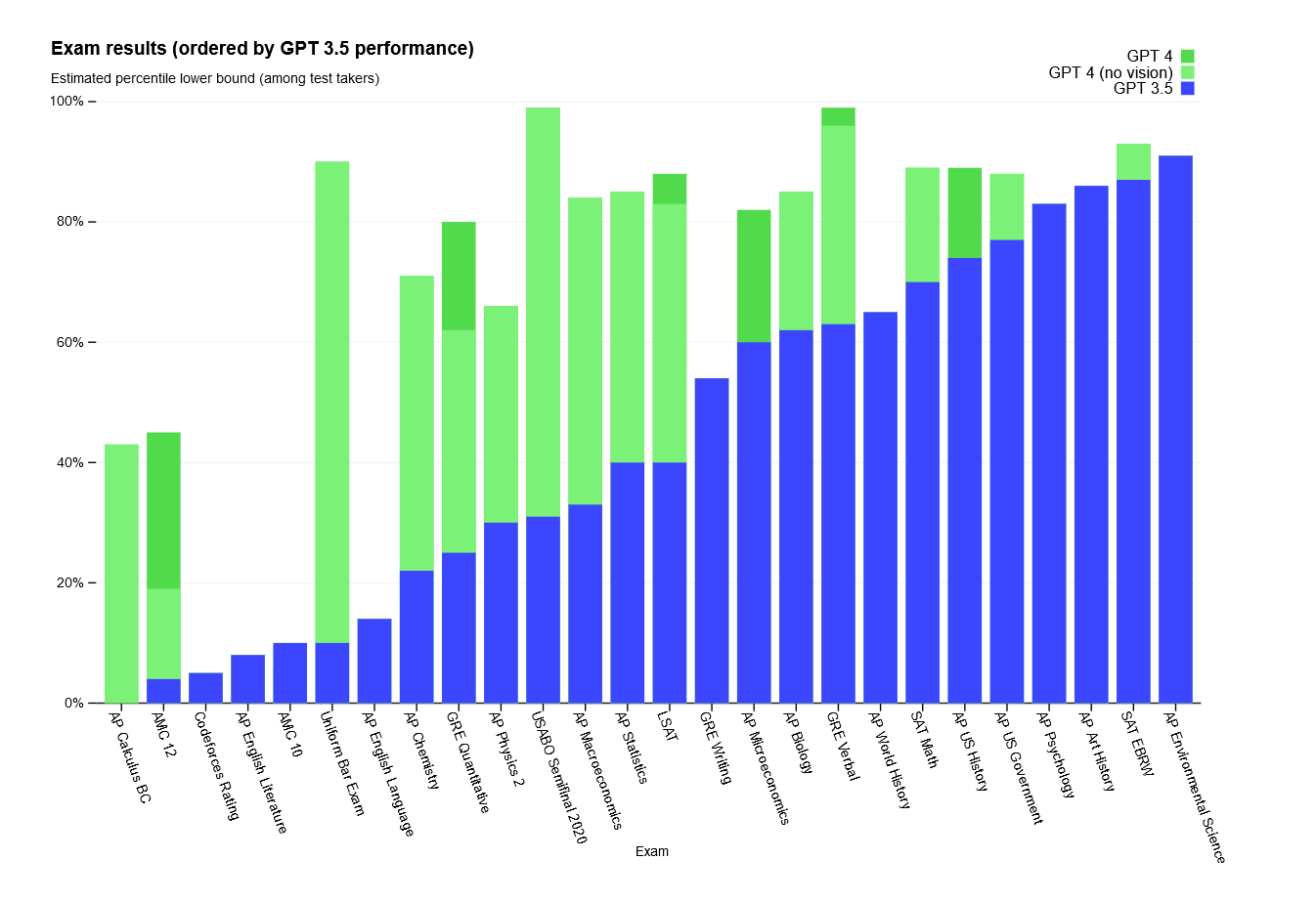 E se você ainda está cético em relação a superioridade da nova versão da rede neural, saiba que ela passou - e quase gabaritou - basicamente todos os testes: o bar exam (a versão da OAB americana) com 90%, LSAT (a versão do vestibular americano) com 88%, GMAT, etc…